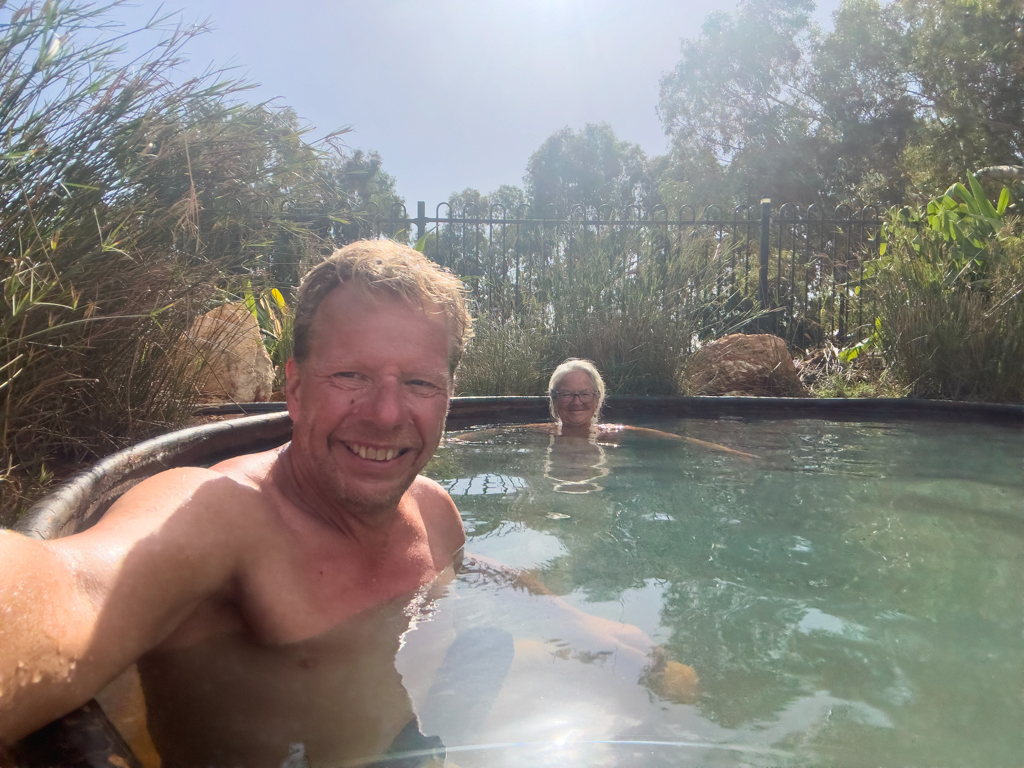 Zum hiesigen Campground gehören neben Bar und Restaurant auch 4 Warmwasser Pools, von denen wir uns einen aussuchen. Schön langsam, um das wohlige Gefühl auch auskosten zu können, spazieren wir über die Treppe in das warme Wasser hinab. Im Gegensatz zu den sonstigen heissen Schwefel-Quellen, die einen nicht gerade feinen Geruch nach faulen Eiern verströmen, ist hier die Warmwasserquelle eisenhaltig. Wir, und alle anderen Badehungrigen auch, müssen somit keine Angst vor anlaufendem Schmuck haben.