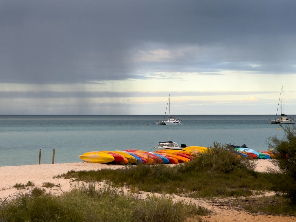 Bei Ebbe kommt die flache und leere Monkey Mia Beach in der Nachmittagssonne gut zur Geltung