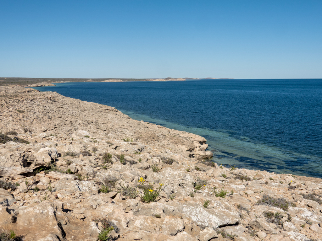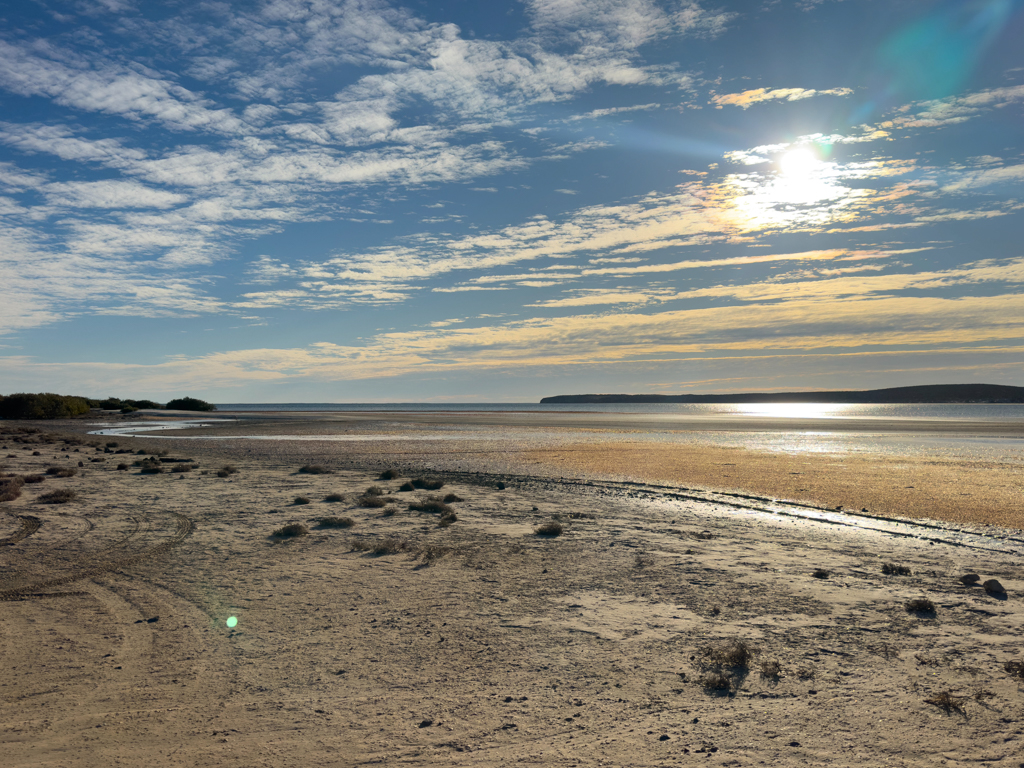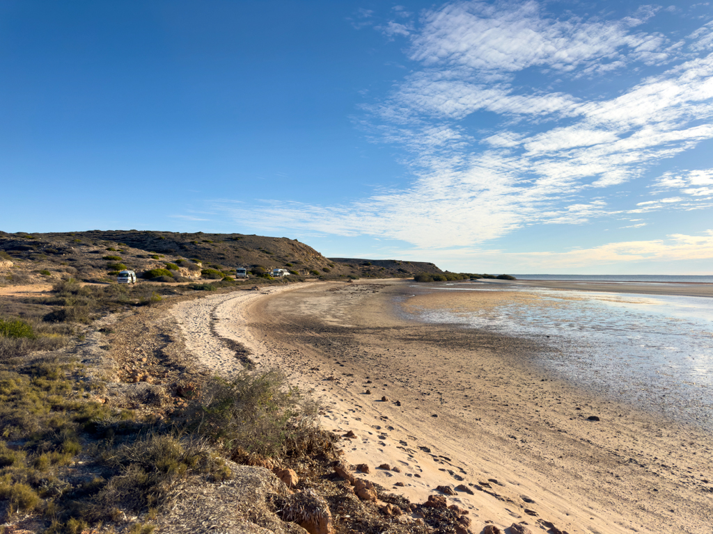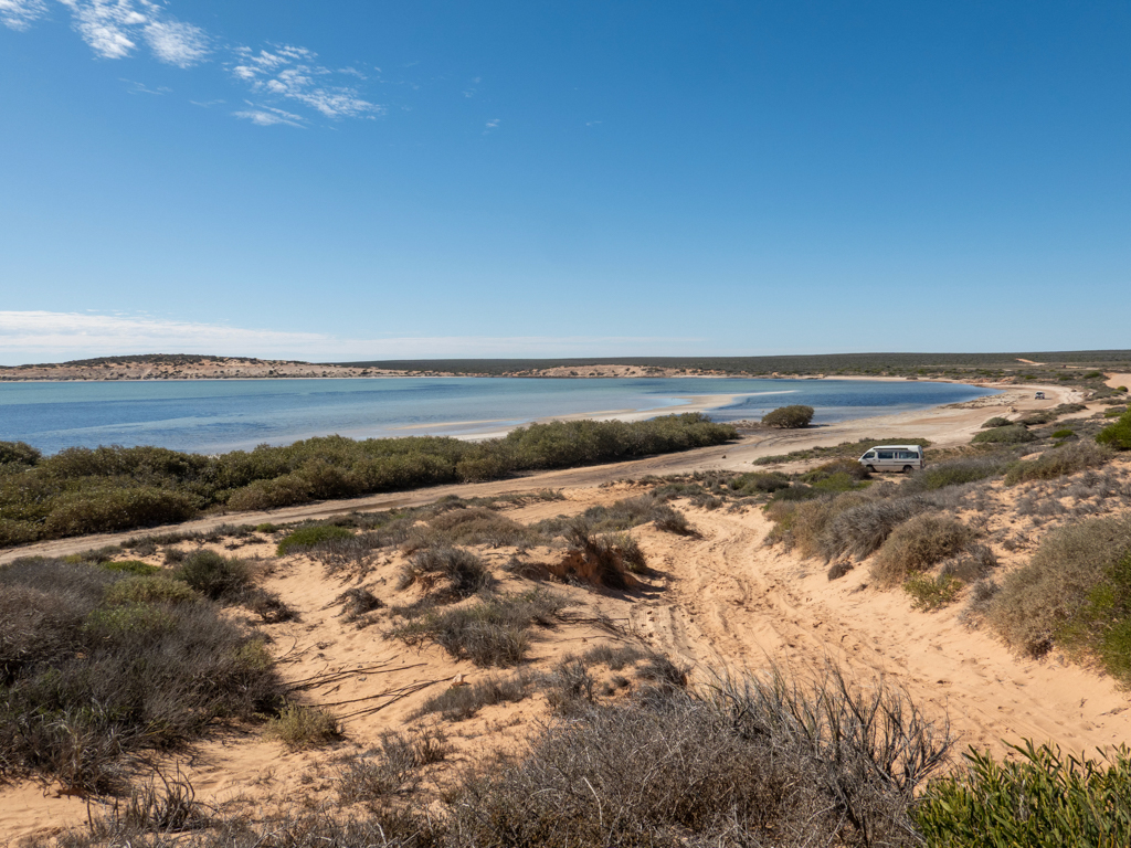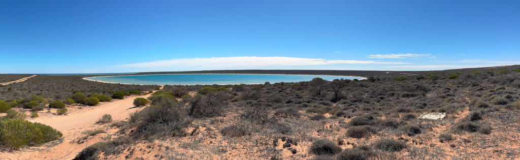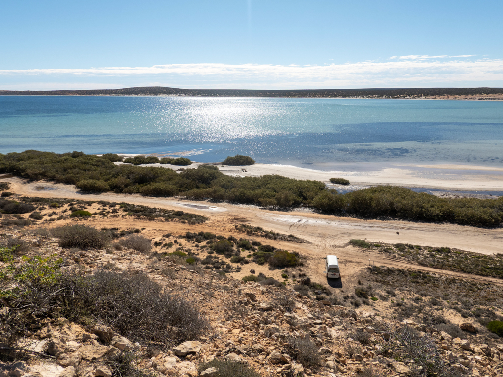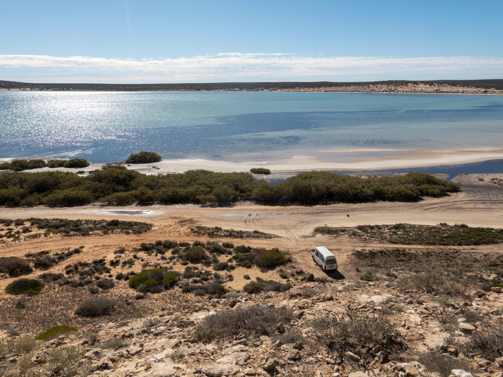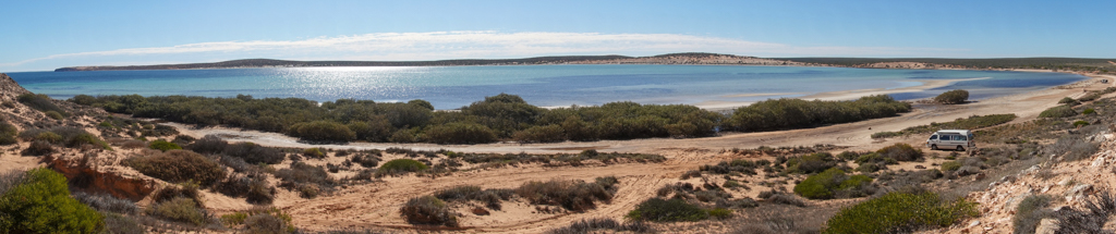 Bis zum Flowers Camp ist es nicht mehr weit. Unser Stellplatz, es ist die Nr. 6, ist der letzte in der Reihe. Mehr gibt es nicht. Was für eine Wohltat nach dem «Massentourismus» in Monkey Mia. Schnell installieren wir unser Camp und machen uns dann direkt auf zu einem Spaziergang durch die Umgebung. Gleich hinter uns geht’s ein paar Meter rauf, erst dann hat man einen freien Blick auf die südlich liegenden kleinen Buchten mit ihren weissen Sandstränden. Auch wenn wir uns die Augen aus dem Kopf starren und uns das suuper duuper Fernglas bei der Suche behilflich ist, ist einfach kein Dugong zu sehen…