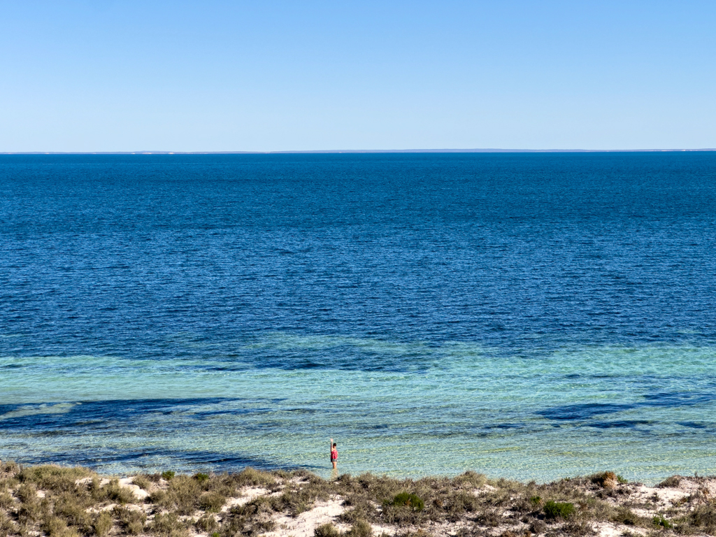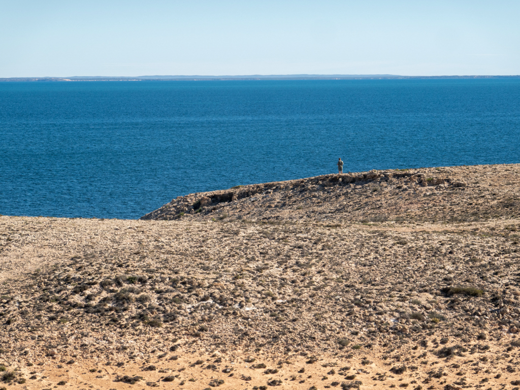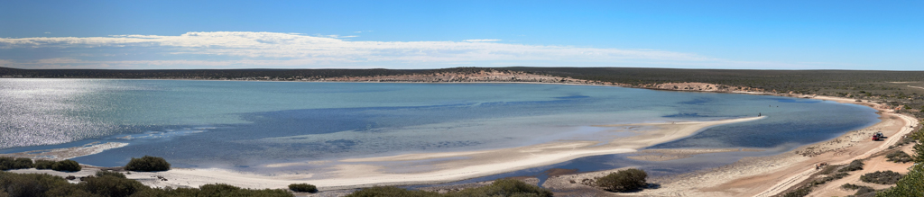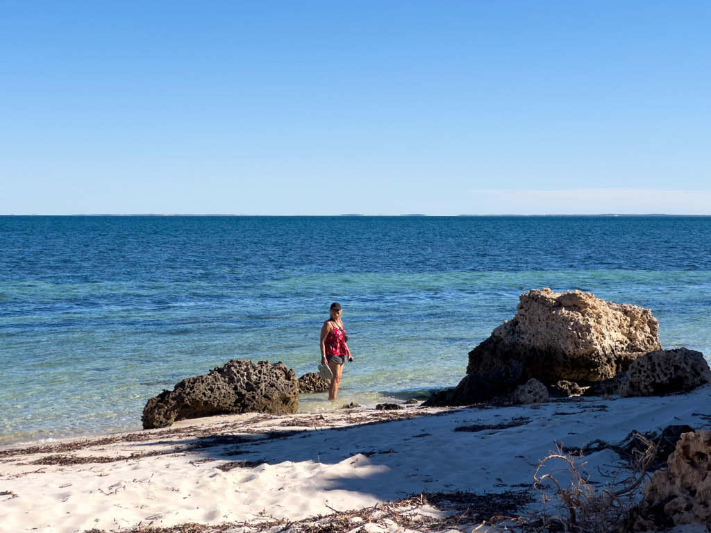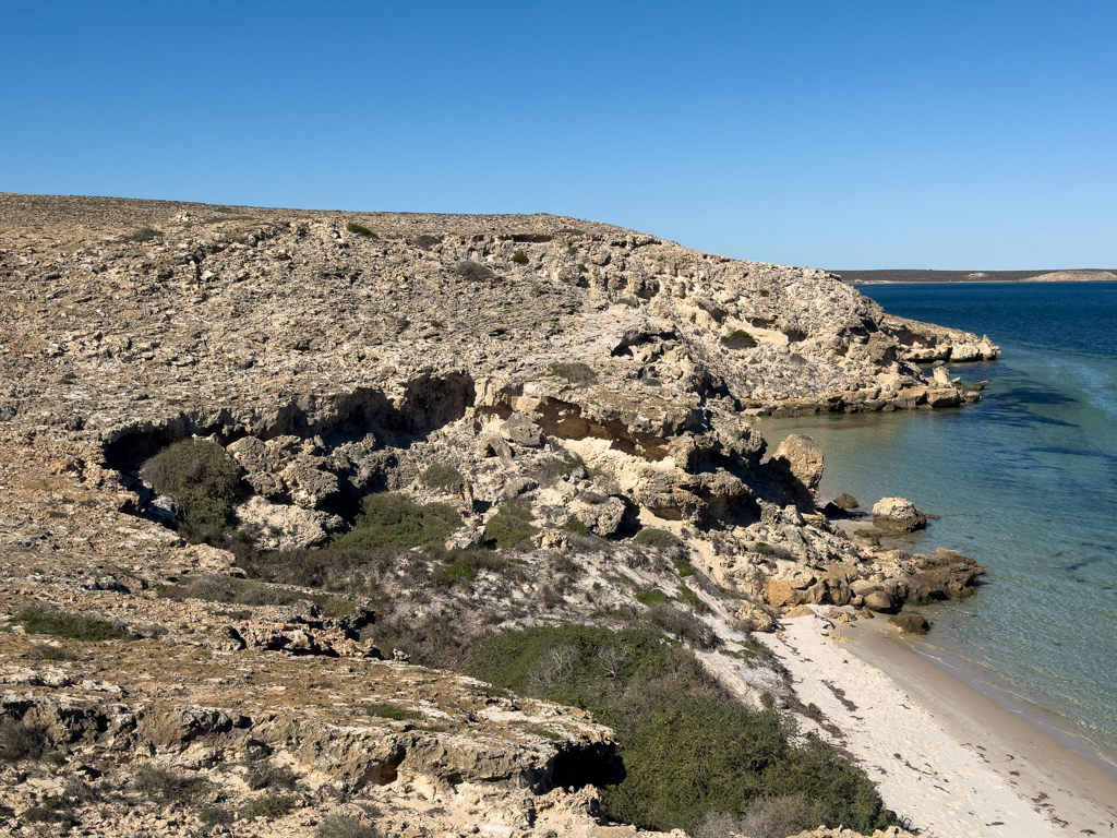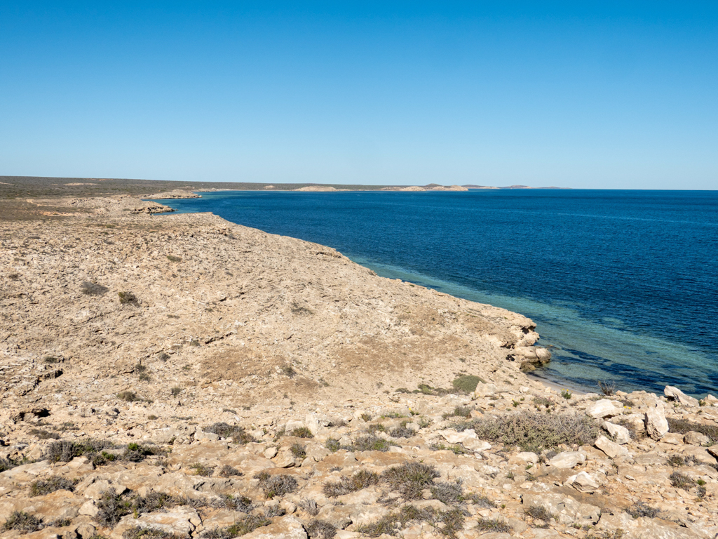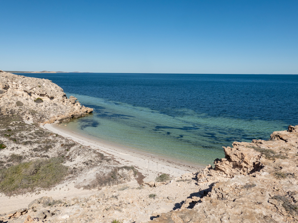 Bis zum Flowers Camp ist es nicht mehr weit. Unser Stellplatz, es ist die Nr. 6, ist der letzte in der Reihe. Mehr gibt es nicht. Was für eine Wohltat nach dem «Massentourismus» in Monkey Mia. Schnell installieren wir unser Camp und machen uns dann direkt auf zu einem Spaziergang durch die Umgebung. Gleich hinter uns geht’s ein paar Meter rauf, erst dann hat man einen freien Blick auf die südlich liegenden kleinen Buchten mit ihren weissen Sandstränden. Auch wenn wir uns die Augen aus dem Kopf starren und uns das suuper duuper Fernglas bei der Suche behilflich ist, ist einfach kein Dugong zu sehen…