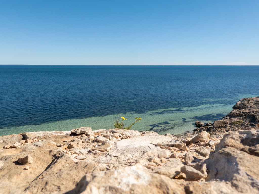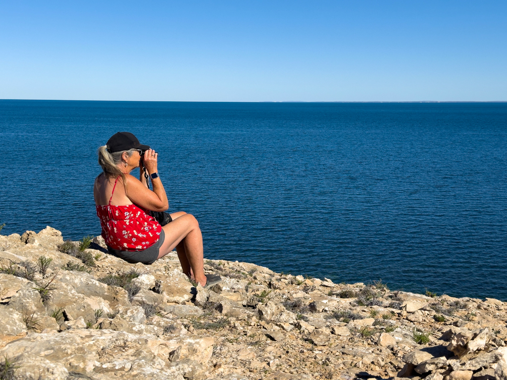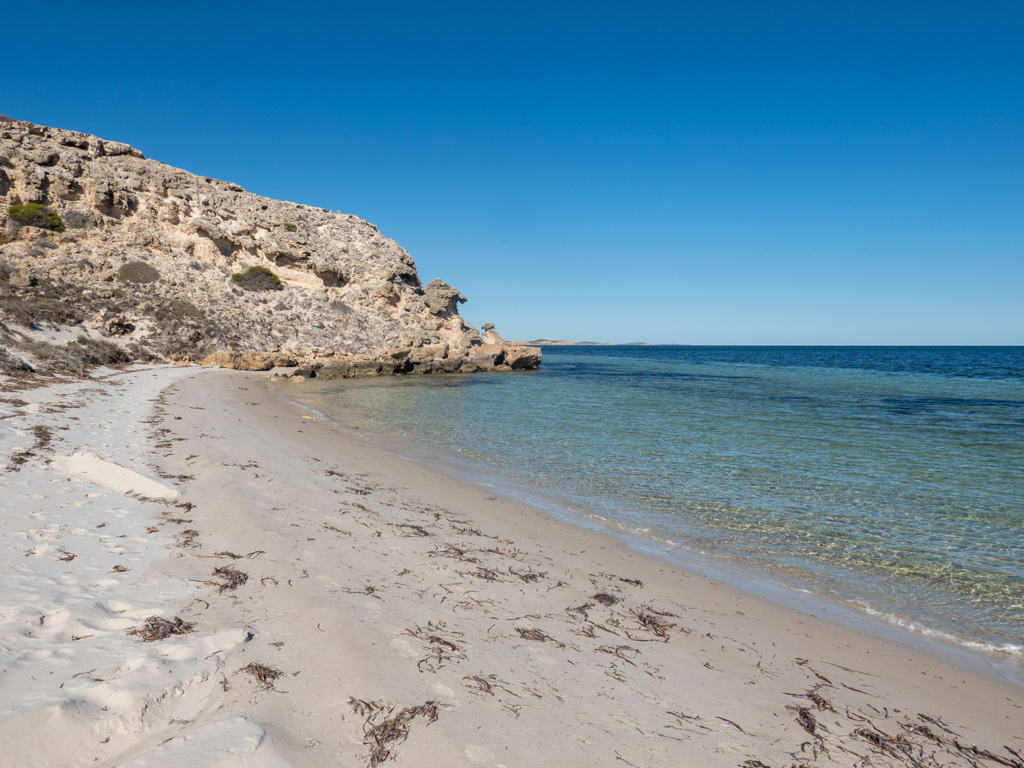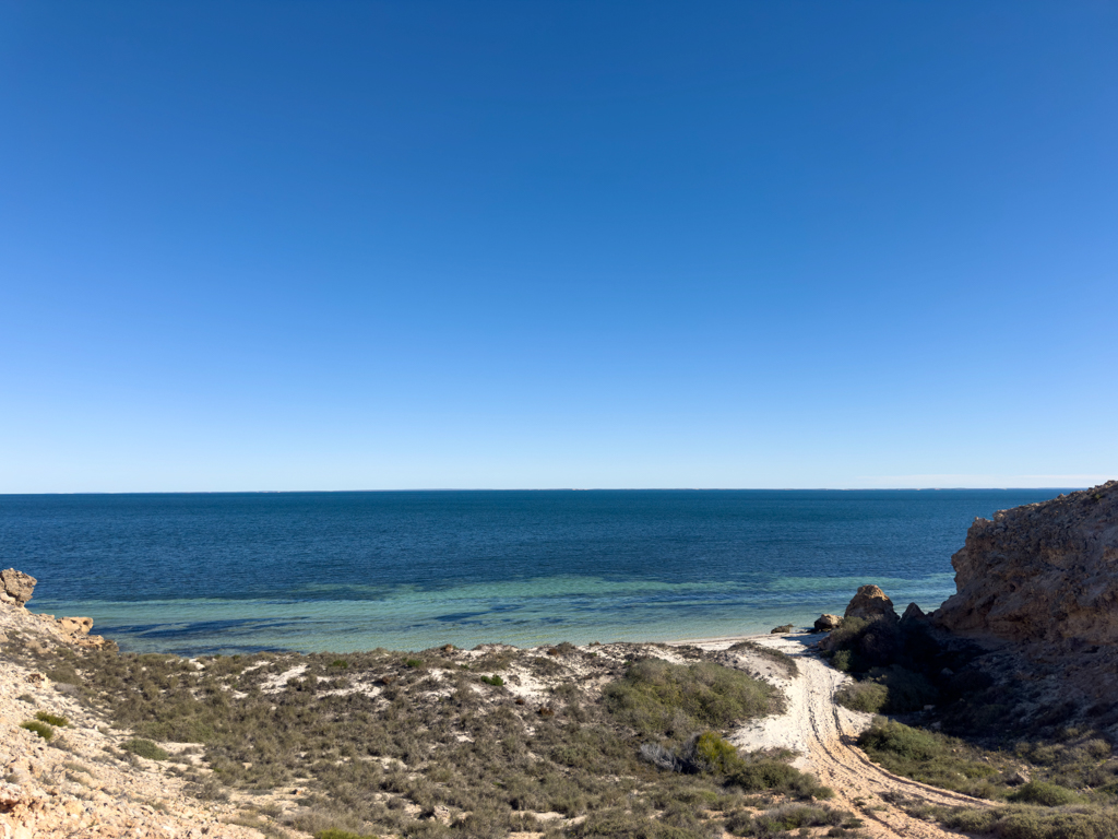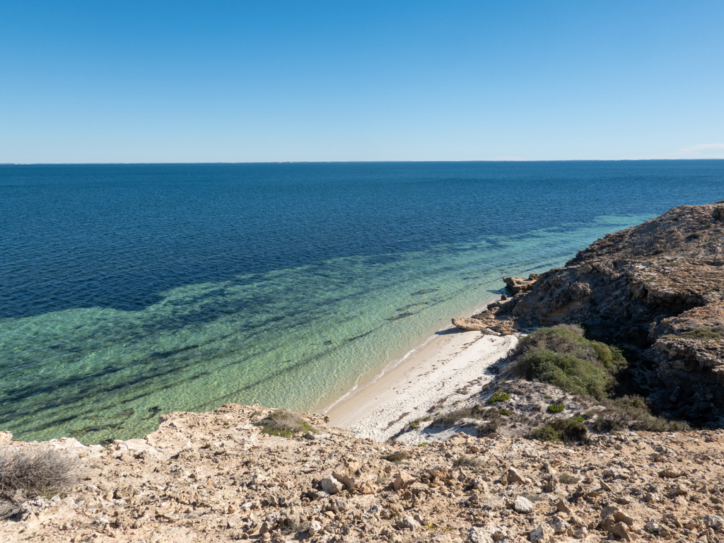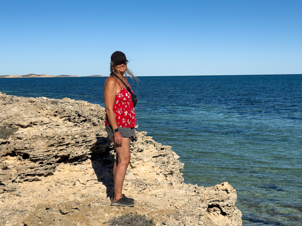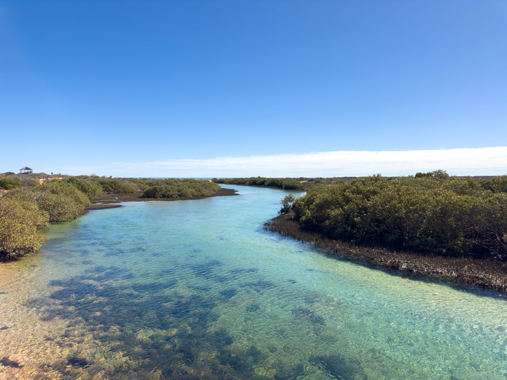 Bis zum Flowers Camp ist es nicht mehr weit. Unser Stellplatz, es ist die Nr. 6, ist der letzte in der Reihe. Mehr gibt es nicht. Was für eine Wohltat nach dem «Massentourismus» in Monkey Mia. Schnell installieren wir unser Camp und machen uns dann direkt auf zu einem Spaziergang durch die Umgebung. Gleich hinter uns geht’s ein paar Meter rauf, erst dann hat man einen freien Blick auf die südlich liegenden kleinen Buchten mit ihren weissen Sandstränden. Auch wenn wir uns die Augen aus dem Kopf starren und uns das suuper duuper Fernglas bei der Suche behilflich ist, ist einfach kein Dugong zu sehen…