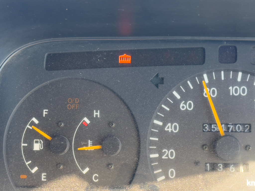 Als Jo Enelis Motor startet, leuchtet erst kurz, dann etwas flackerhaft und dann nicht mehr eine Kontrolllampe in Enelis Armaturenbrett auf. Uff, alles wieder gut! Eine Web-Recherche ergibt, dass das Symbol, das wie ein Rasenrechen aussieht, für den Kühler stehen soll. Dass also irgendetwas mit dem Kühler nicht i.O. ist. Die Temperatur ist es nicht, diese Anzeige ist ziemlich weit unten.