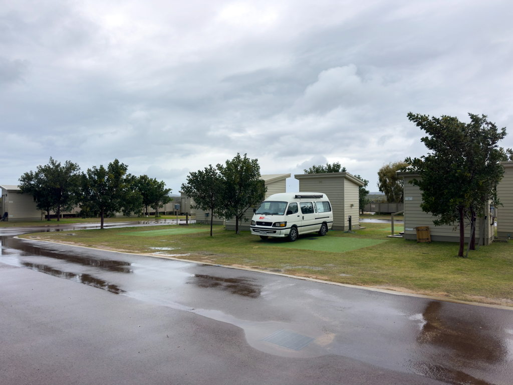 Wir selber hechten immer nur ganz schnell zwischen den Regenschauern oder während eines «Weniger-Regenschauers» kurz zum Kafi kochen die paar Meter in die Camp Kitchen und wieder zurück. Gut, dass unser Badhaus mit 2 Schritten zu erreichen ist.