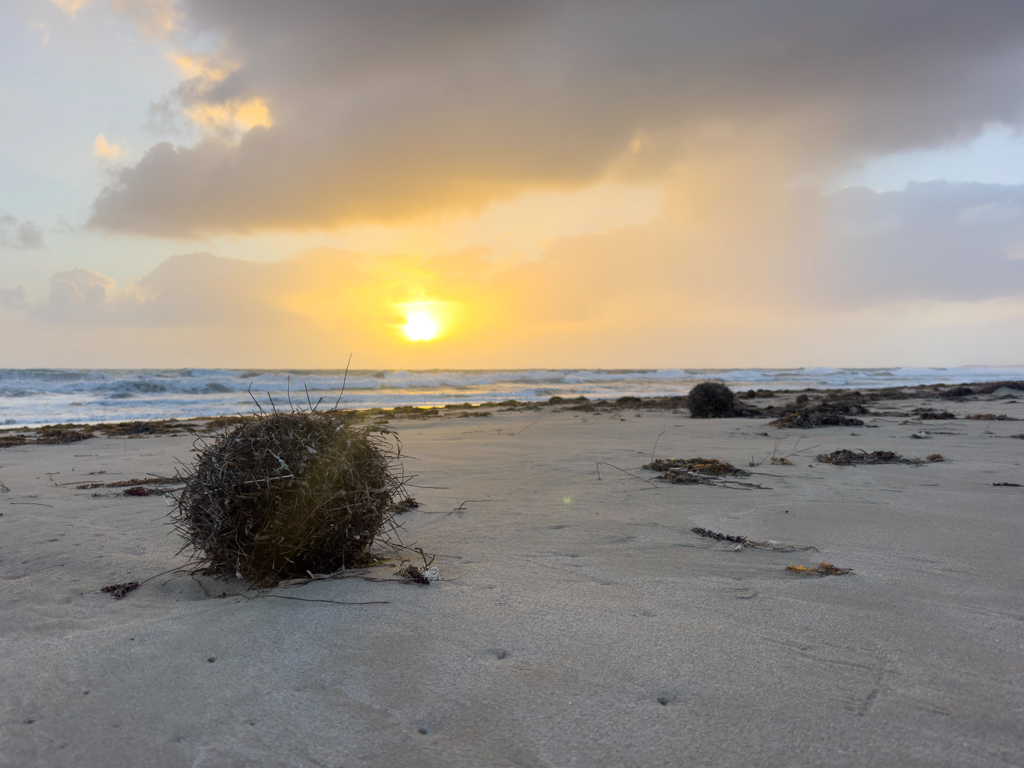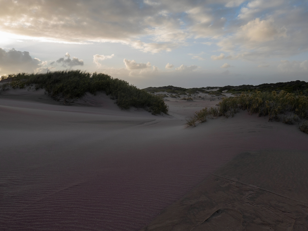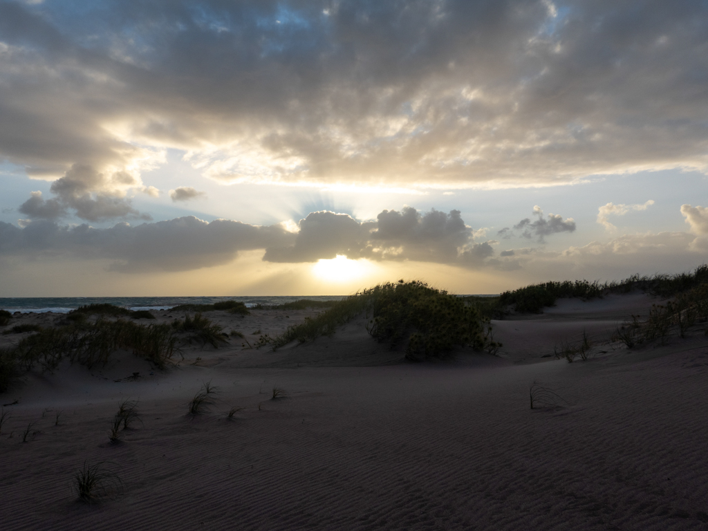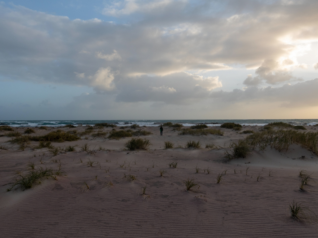 Um nicht doch noch in einen Regenschauer zu kommen, warten wir nicht oben auf der Düne auf den Sonnenuntergang, sondern wollen diesen doch unten vom Strand aus bewundern. Der Weg an der Beach entlang ist wesentlich kürzer als der durch die Dünen.