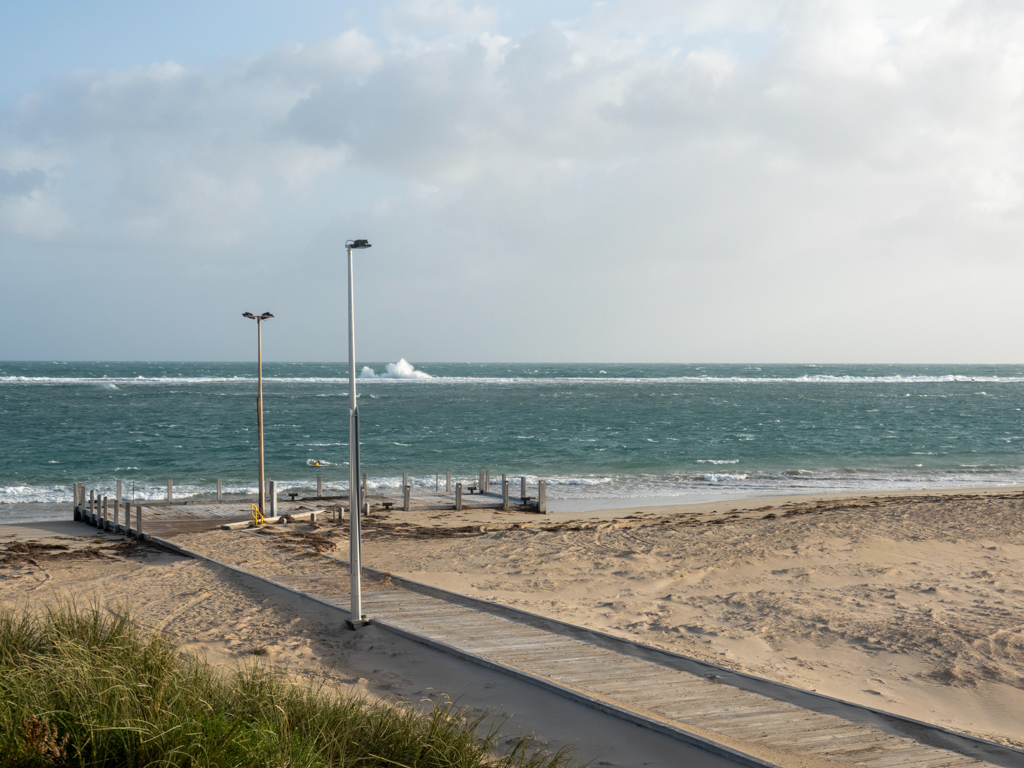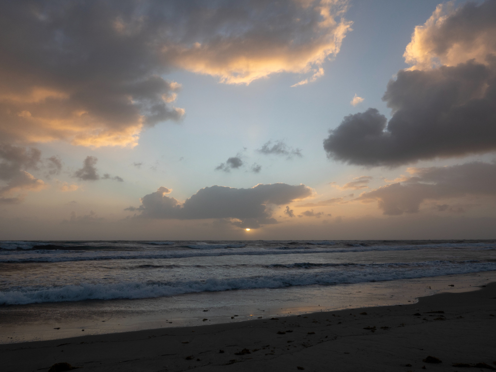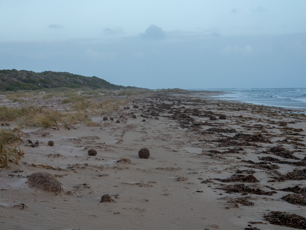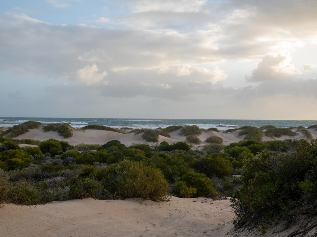 Um nicht doch noch in einen Regenschauer zu kommen, warten wir nicht oben auf der Düne auf den Sonnenuntergang, sondern wollen diesen doch unten vom Strand aus bewundern. Der Weg an der Beach entlang ist wesentlich kürzer als der durch die Dünen.