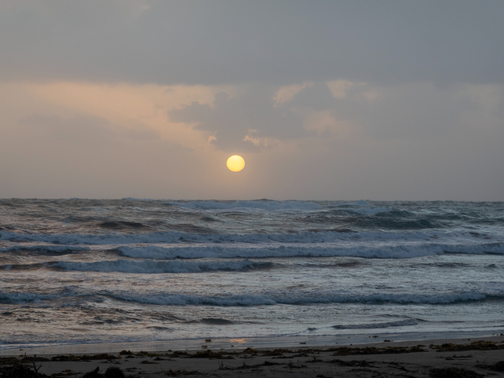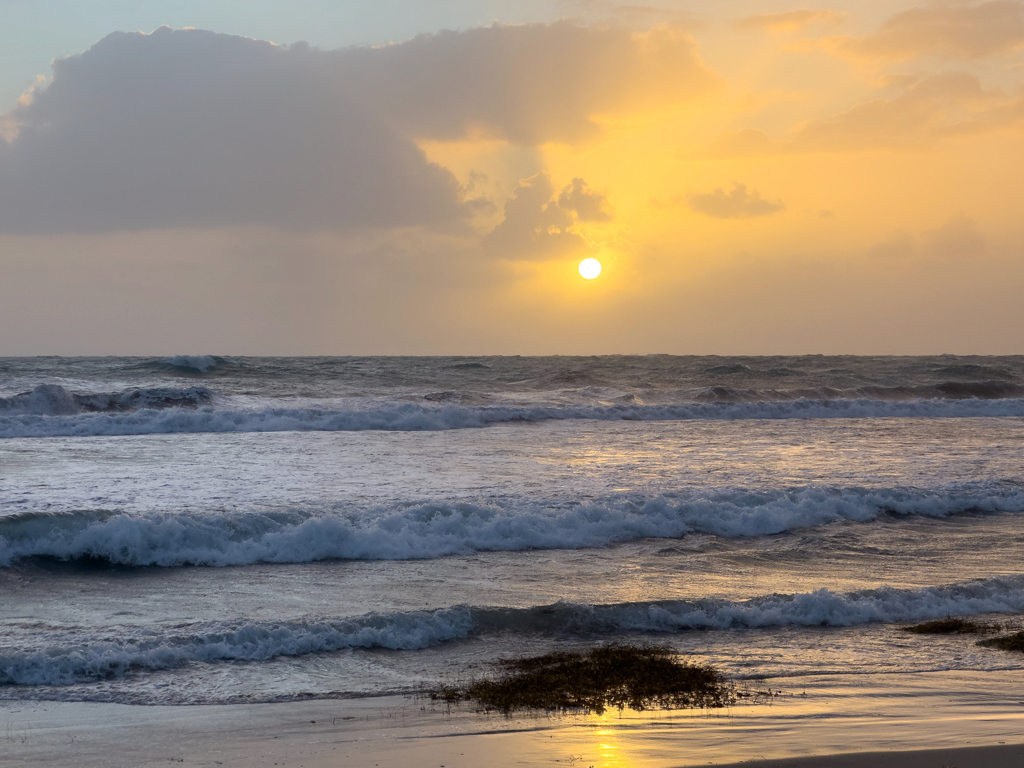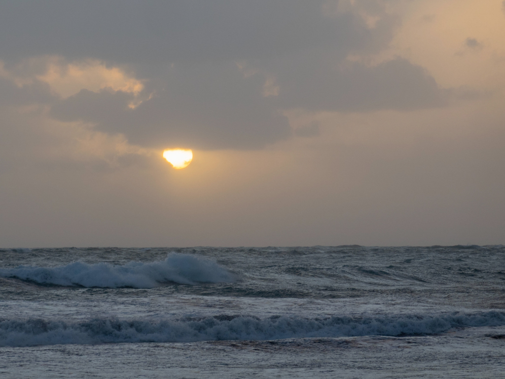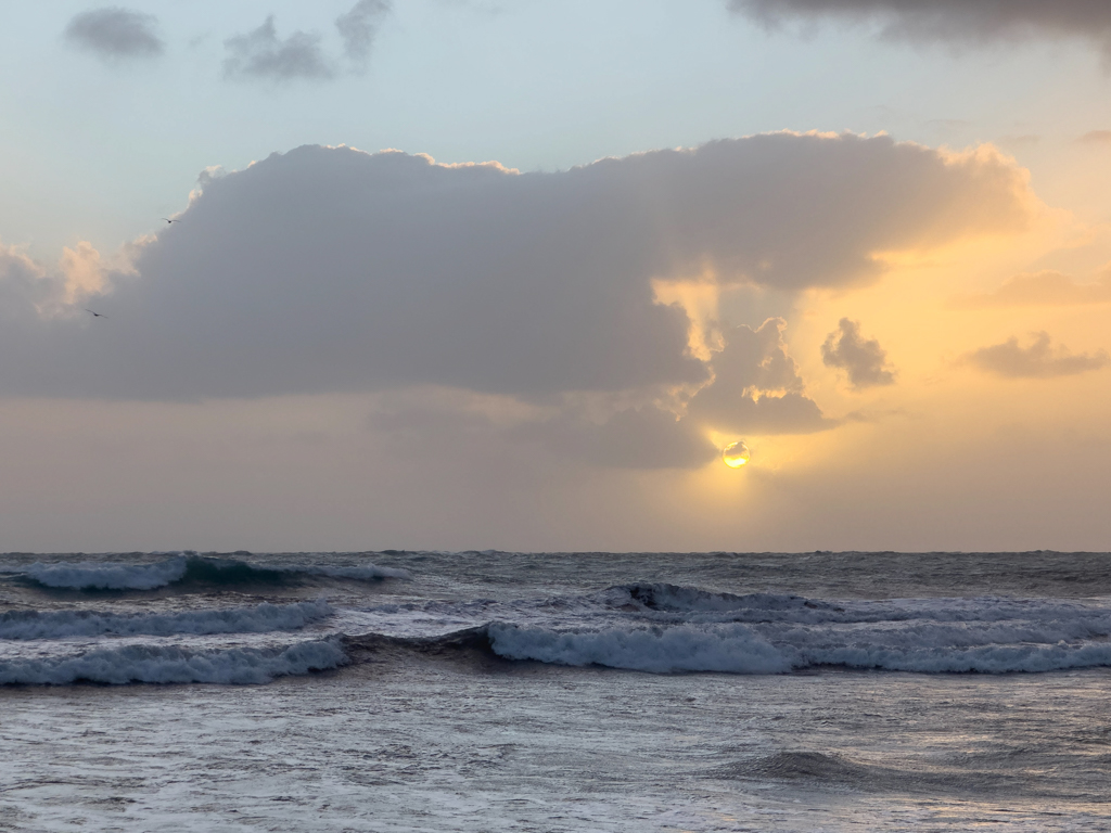 Dort wo es kein schützendes Riff gibt, tost und faucht das Meer wie ein wilder Drache und ungebremst rollen die Wellen auf das Land zu. Dunst schiebt sich vor die Sonne, später auch noch dichte Wolken. So wird das nichts mit einem dramatisch aussehenden Sonnenuntergang. Der Wind hat an Stärke zugelegt und bläst uns ordentlich um die Ohren. Heute ist kein Hai im Wasser zu sehen. Aus der kurz angedachten Wanderung sind nun doch 2 Std. geworden, die uns ordentlich vor Hunger knurrende Bäuche einbringen.