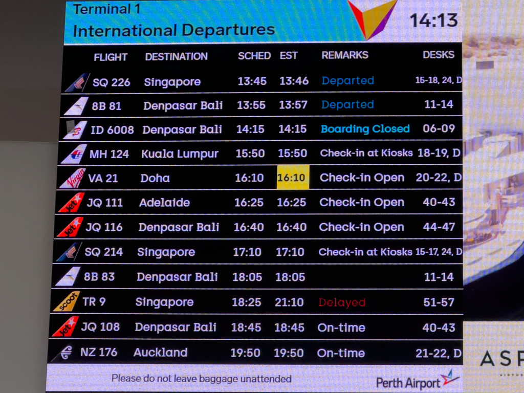 «Keep it simple», wie die Aussies nun mal sind, heisst Perth Flughafen einfach auch Flughafen Perth. Zum Check-In sind wir eine gute Stunde zu früh dran. Im Little Creatures gibt’s etwas gegen den aufkommenden Hunger. Als das Check-In öffnet, ist es Zeit für uns…