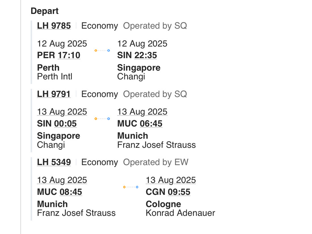 Von Perth geht’s 5 ½ Stunden zum ersten Stopp in Singapore. Von dort fliegen wir in knapp 13 Stunden weiter nach München und dann schliesslich in 50 Minuten nach Kölle am Ring (Köln am Rhein), wo uns unser Freund Bert in Empfang nimmt. Total sind wir etwas über 24 Stunden unterwegs.