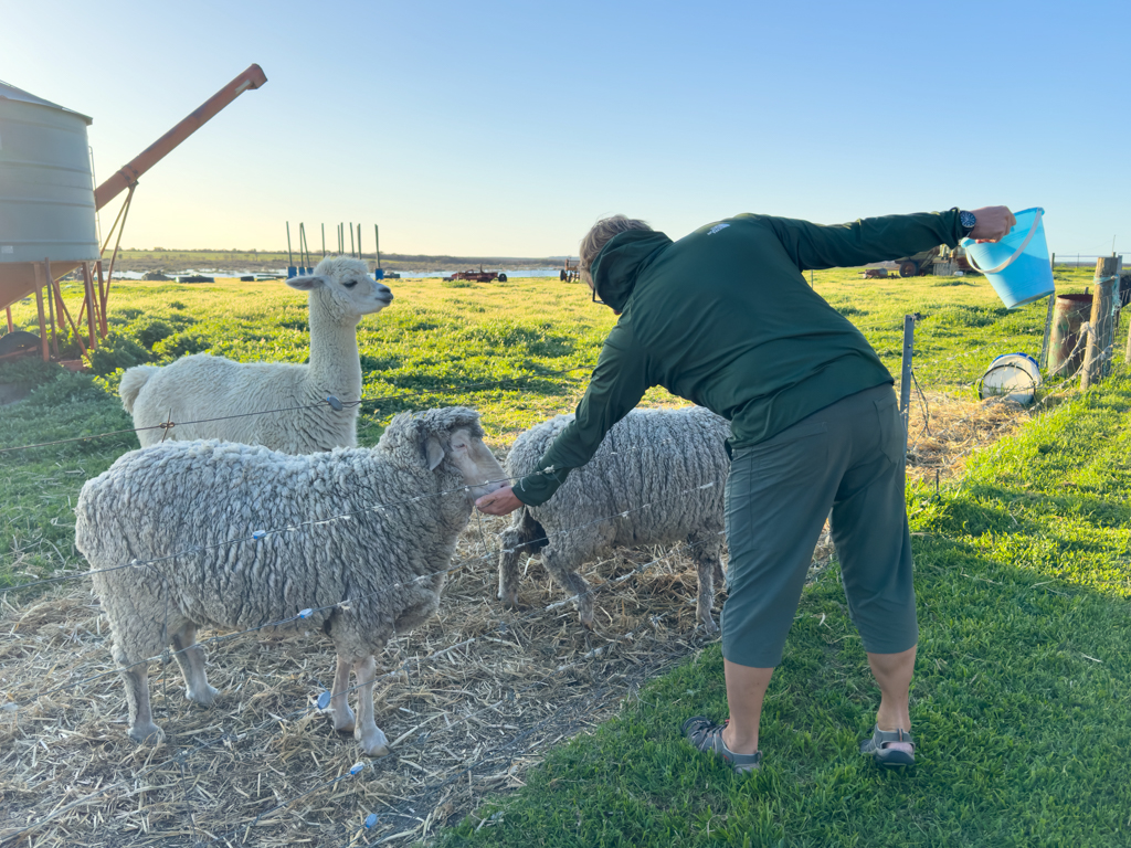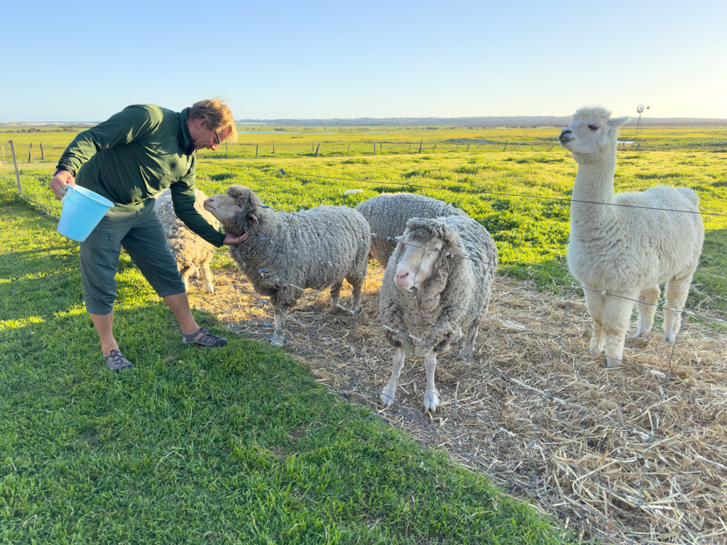 Nach einem kleinen Apéro finden wir uns mit noch anderen Gästen zur Fütterung der Schafe, der Esel und des jungen Munis am Weidezaun ein. Die Schafe sind besonders hungrig. Sie kommen förmlich durch den Maschenzaun gekrochen. Nur wenige Plätze sind im Campground der Station belegt, entsprechend ruhig geht es hier zu.