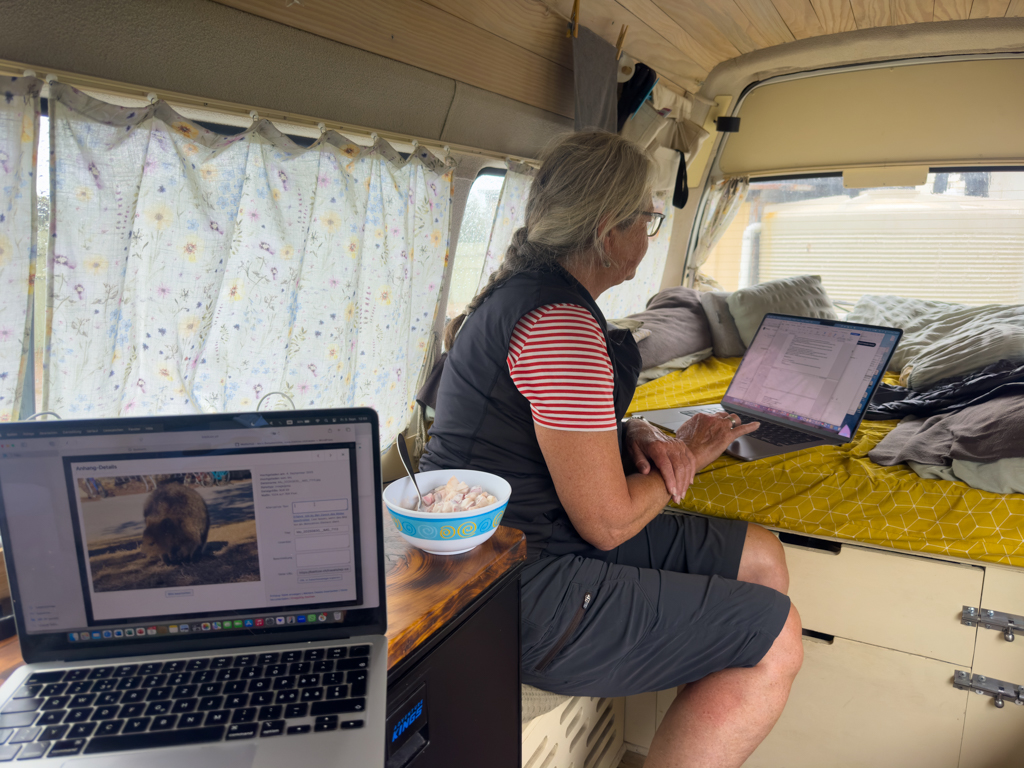 Zur abgemachten Zeit rufen wir bei Guilhem an. Er vertröstet uns auf etwas später. So in 1 ½ Stunden. Ma muss später noch einen Arbeitscall durchführen. Aber das sollte schon gehen. Während der Wartezeit aktualisieren wir etwas unser Reisetagebuch und Ma bereitet unser Verkaufsangebot für Eneli schon etwas vor. So etwas ist immer mehr Arbeit, als man denkt. Schliesslich wollen wir unsere Eneli auch im guten Licht präsentieren.