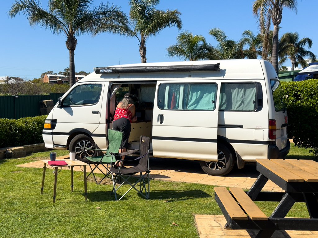 Jo kommt mit ein paar Nachbarn ins Gespräch. Ein Pärchen ist aus Brisbane, die anderen beiden aus Neuseeland. Als die Sonne langsam untergeht und es merklich kühler wird, verteilen wir uns zum «Znachten» alle auf unsere kleinen rollenden Häuser.