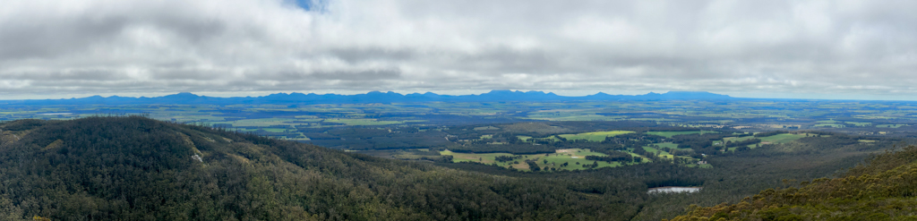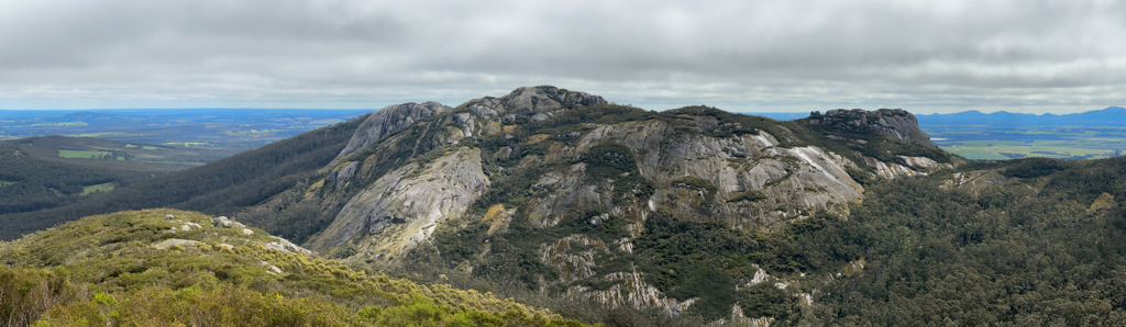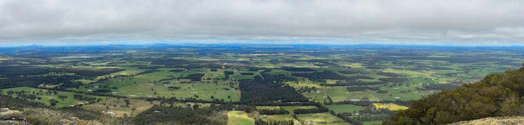 Die Berge hier sind eher grosse «Elephant Rocks», grosse rundgeschliffene Felsen, die sich aus der Landschaft erheben. Während wir nacheinander einige dieser Felsen durchwandern, merken wir, wie sich die dichte Wolkendecke langsam hebt. Die Bergspitzen der Stirling Range, einer Bergkette noch etwas weiter nördlich, kommen immer mehr aus den Wolken heraus. Es ist tut uns gut, mal wieder die alten Knochen und steifen Muskeln zu bewegen. Vom letzten Gipfel, dem Morgans View, von dem wir aus in Richtung Albany und dem bunten Flickenteppich der vielen bewirtschafteten Felder schauen können, geht es steil hinab. Ausser ein paar kleinen Eidechslis, die sich von der aufkommenden Sonne wärmen lassen, sehen wir keine weitere Tiere um uns herum.