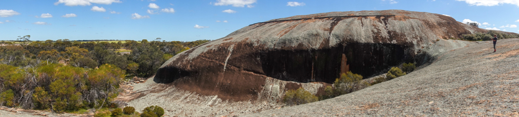 Warum auch immer, ist schon früh am Morgen viel los. Fast alle packen zusammen, räumen auf und sind schon früh wieder auf und davon. Die fertige SuperBowl wartet noch darauf, unsere Gaumen zu verwöhnen, als Brett mit Auto und kleinem Anhänger vorbeirollt. Er fragt, ob wirklich alles ausgebucht sei. Ja, wegen des Musikfestivals ist das so. Die Campsites hier sind so riesig, dass wir ruhig unsere mit ihm teilen können. Als Frühaufsteher ist er es gewöhnt schon um 5 Uhr zu arbeiten, so habe er schon sein halbes Tagwerk vollbracht und dabei ist es gerade mal kurz vor 10 Uhr! Jetzt hat noch 2 Stunden Zeit, um den Wave Rock zu erkunden, dann muss er noch etwas weiterarbeiten. Schnell ist er nach dem Aufstellen seines Camps wieder verschwunden.