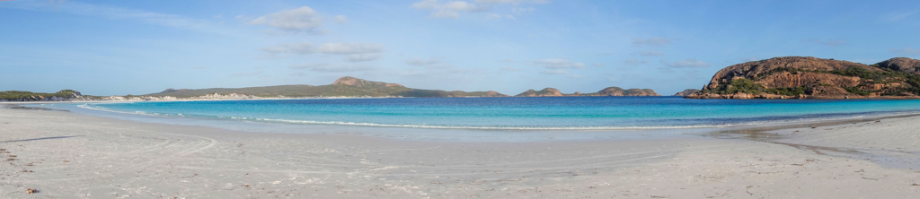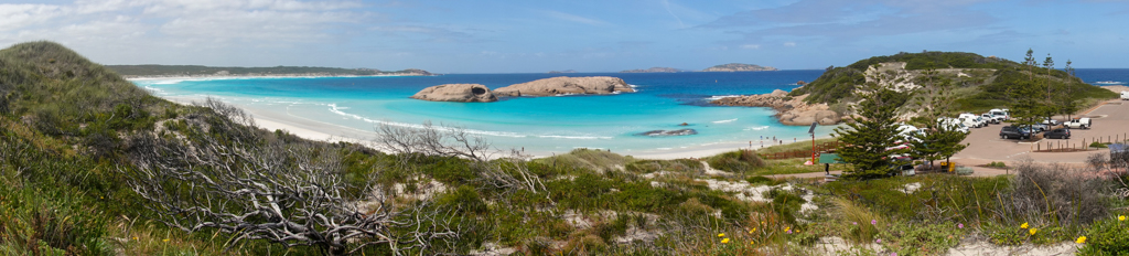 Gut 5 km vor Esperance biegen wir vom HWY1 auf den Great Ocean Drive ab. Der macht einen Bogen an der Küste entlang und ist daher auch mit 35 km um einiges länger. Dafür wesentlich schöner und interessanter. Nicht nur weil wir wieder gemütlicher cruisen können, es blühen auch mehr Blumen an den Strassenrändern. Immer wieder gibt es Abzweigungen zu verschiedenen Bays/Buchten. Eine, die uns sehr ans Herz gelegt wurde, ist die Twilight Beach. Diese soll den weissesten Strand von ganz Australien haben und sei ein «Must See».