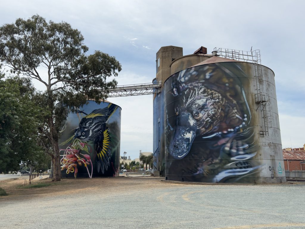 Jetzt können wir in aller Gemütlichkeit zur Iris und Familie nach Wangaratta fahren. Doch davor machen wir noch kurz Halt bei Rochester’s Silo Art: Zwei Silos sind hier vorne und hinten äusserst kunstvoll bemalt worden mit heimischen Tieren. Weil wir wie immer keine Lust auf HWY haben, gondeln wir die Nebenstrecke entlang, die auch nur ein paar Minuten länger dauert. Schliesslich sind es keine 200 km mehr, die heute noch zu fahren sind.