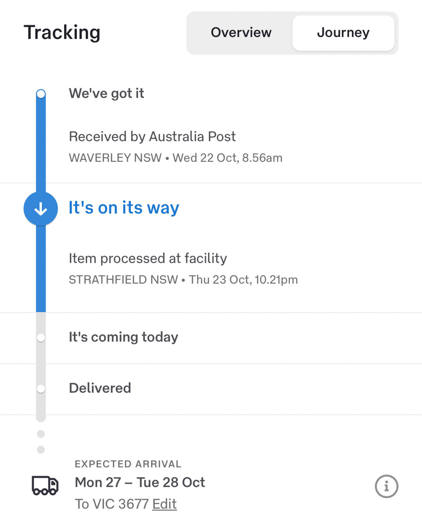 Bei der Post wird uns erklärt, dass der nächste Schritt im Trackingcode die Zustellung gegen Unterschrift sei. Die Reise über Melbourne werde nicht unbedingt getrackt. Wir brauchen uns noch keine Sorgen machen. Schliesslich seien erst drei Arbeitstage vergangen.