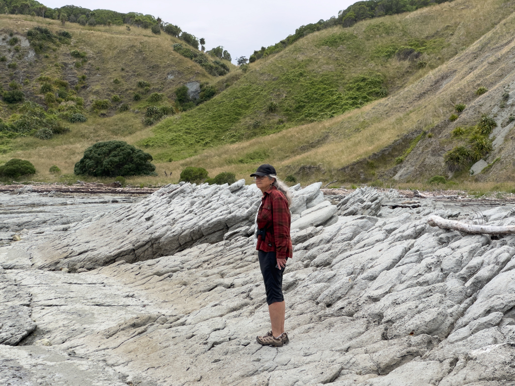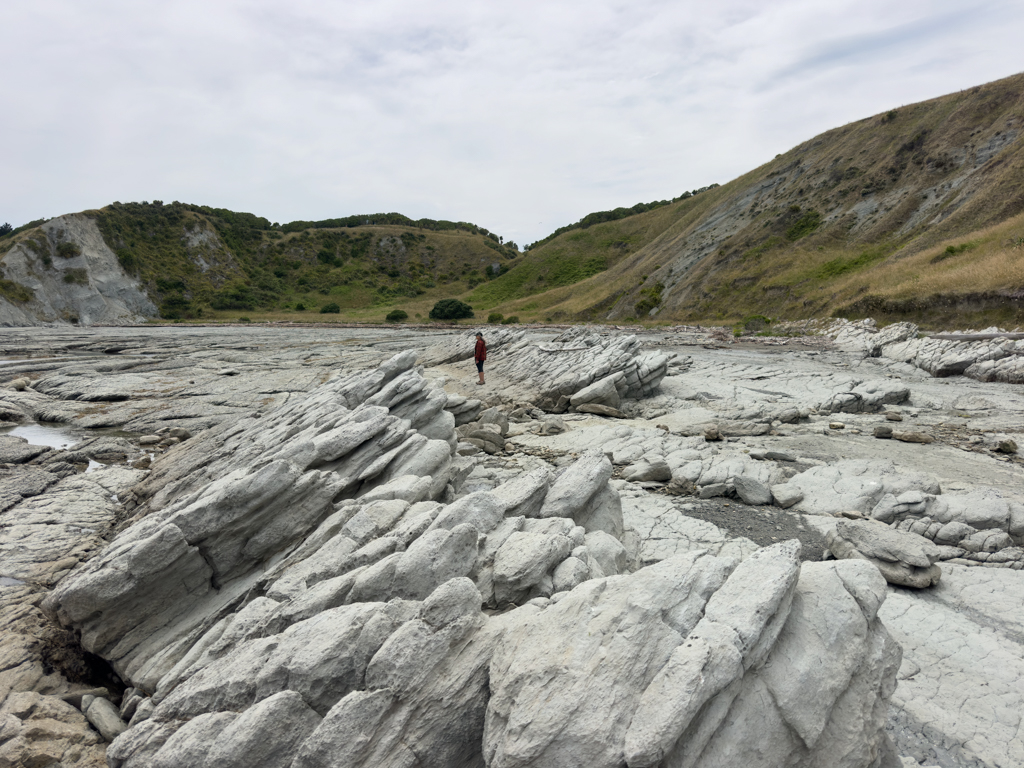 Diese Gesteine wurden über Jahrmillionen unter dem Meer abgelagert, später durch tektonische Kräfte stark gefaltet und teilweise gehoben. Dadurch ragen sie heute weit ins Meer hinein und zeigen beeindruckende Schichten und Verwerfungen. Die Schichtung ist an vielen Stellen gut sichtbar und ergibt oft wellenförmige oder „gewobene“ Strukturen im Fels. Die Mudstone Bay liegt im Bereich der weicheren Mudstone-Plattformen: im Vergleich zum Kalkstein sind diese flacher und tragen oft tiefer eingeschnittene Rinnen und Pools. Gerade bei Ebbe kann man dort sehr schön die Strukturen der Schichten und Rinnen erkennen, die durch die Kombination von Wellenkraft, Erosion und den unterschiedlichen Härtegraden des Gesteins entstanden sind. Die Limestone Bay zeigt härtere Kalksteinbänke, die oft markantere Kanten und Sockel ausbilden – diese können bei stürmischer See spektakulär von Wasser überströmt werden. Ein spannender Punkt ist, dass die Küstenlandschaft hier nicht „ruhig“ ist: Die Region gehört zu einem der aktivsten tektonischen Zonen Neuseelands. Erdbeben wie das von 2016 haben das Gelände gehoben – das verändert Steilküsten, Felsplattformen und sogar den Zustand der Mudstone Bay spürbar innerhalb eines einzelnen Lebensalters. |