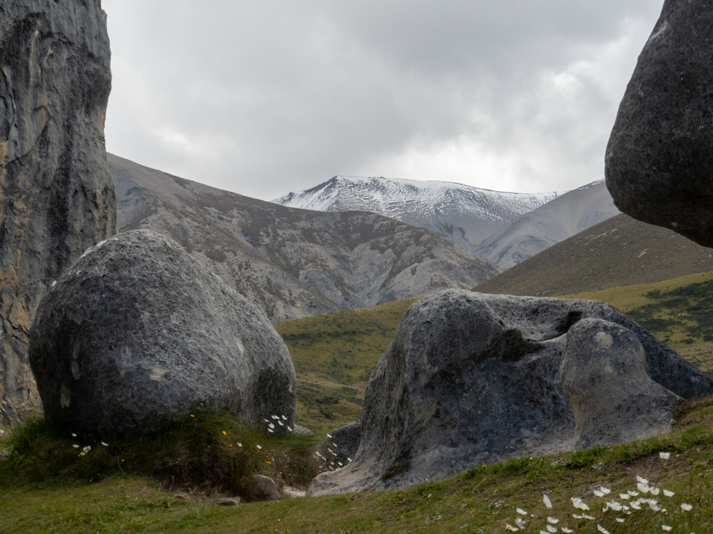 Nach einer knappen Stunde Fahrt gen Nordwesten, die uns über den Porters Pass mit seinen 942 Hm führt, machen wir eine Rast in der Castle Hill Conservation Area. Schon von weitem sehen wir, dass schon andere Touristen die gleiche Idee wie wir hatten. Eine lange Schlange grösserer Camper parkt am Strassenrand und der Parkplatz scheint auch voll zu sein. Scheint aber auch nur so. Wir haben Glück, dass der grosse Ansturm schon vorbei scheint. Es herrscht reger Rangierverkehr, so dass wir schnell einen ausreichend grossen Parkplatz finden. Wir folgen einfach der Menschenschlange, die dasselbe wir wie möchte: Sich von der einmaligen Landschaft und der Geologie beeindrucken lassen.