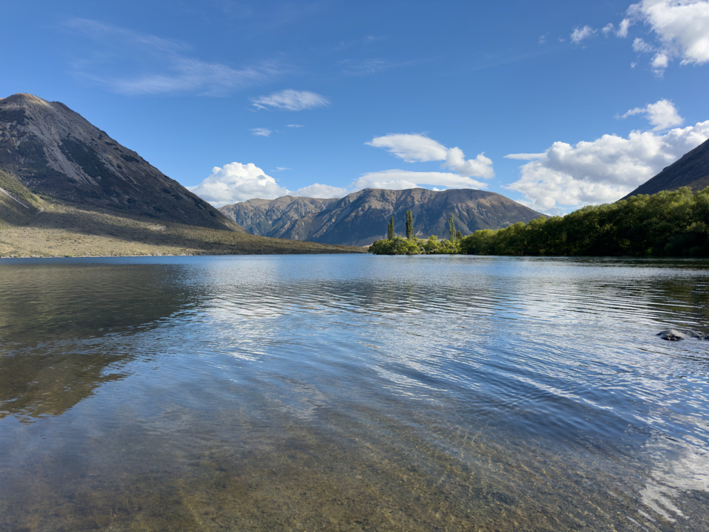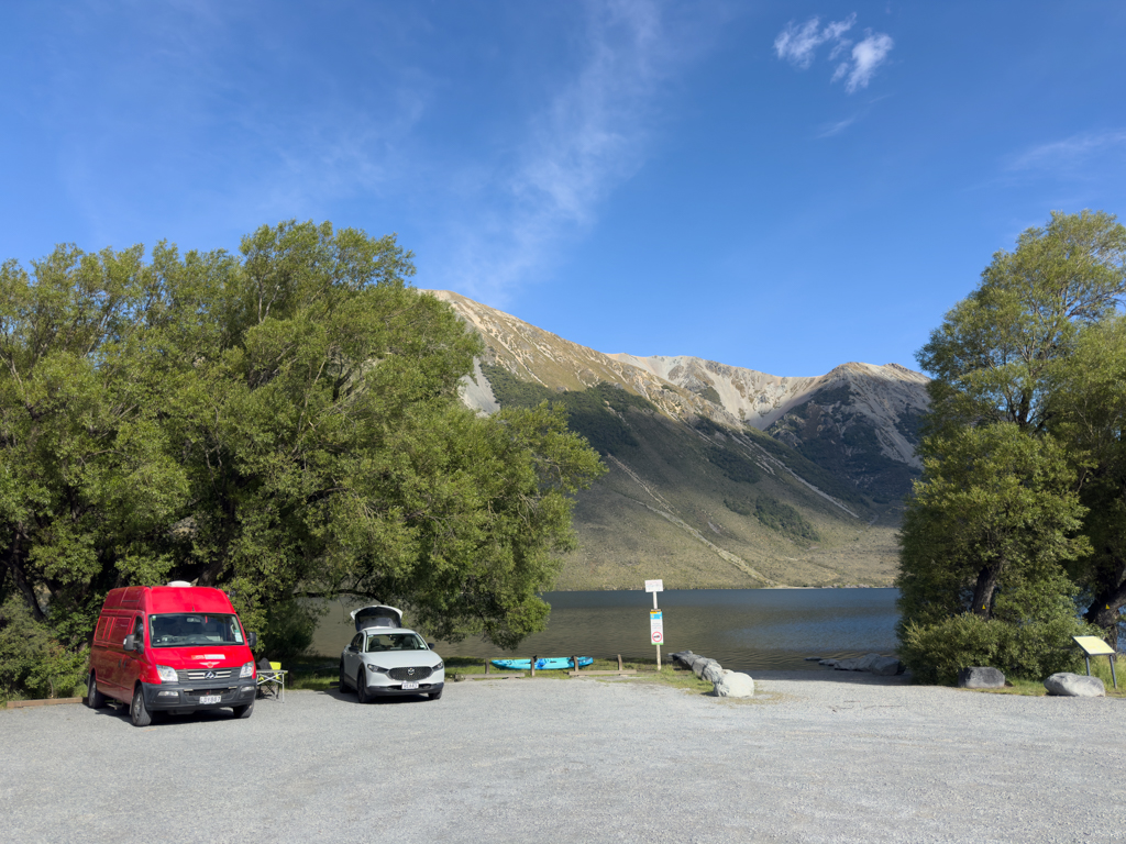 Jetzt sind es noch knapp 25 min. bis wir auf den DOC Campground beim Lake Pearson einbiegen. Es wäre auch ein Wunder gewesen, wenn wir bei dem herrlichen Wetter und bei diesem Bergseepanorama die einzigen wären, die hier übernachten…