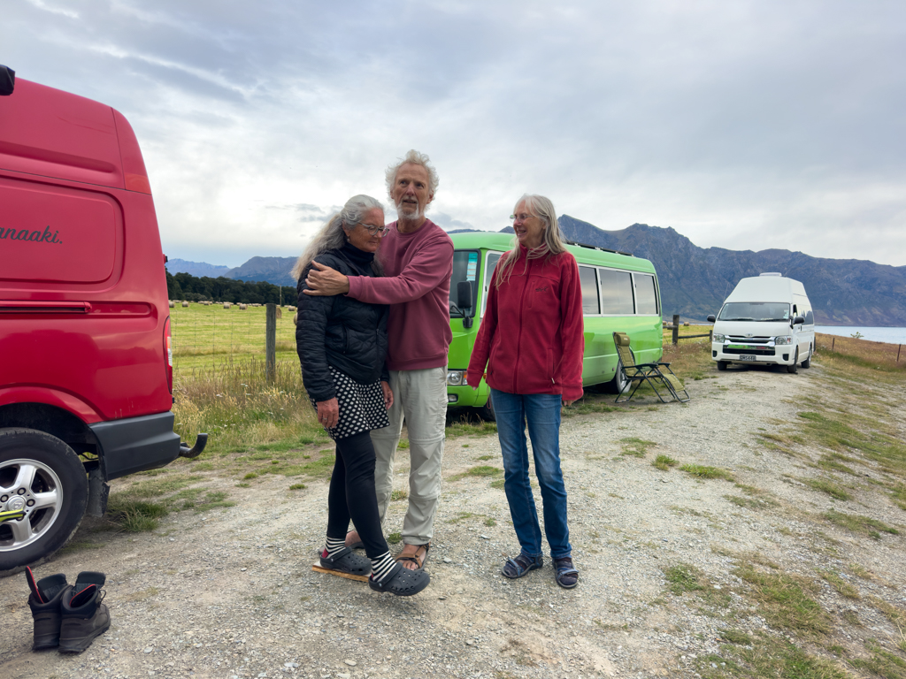 Jo ist noch mit dem Abwasch zu Gange als unsere beiden neuen Freunde anspaziert kommen. Brigitte ist recht unglücklich, weil der Campground voll ist und die beiden in der Partyzone stehen. Schnell bereitet sich ein Lächeln in ihrem Gesicht aus als wir erklären, dass wir ihnen den schönsten Platz freigehalten haben. Schnell wie der Wirbelwind kommt Uli an und parkiert sich perfekt ein. Beide sind froh um diesen ruhigen Platz mit Seesicht.