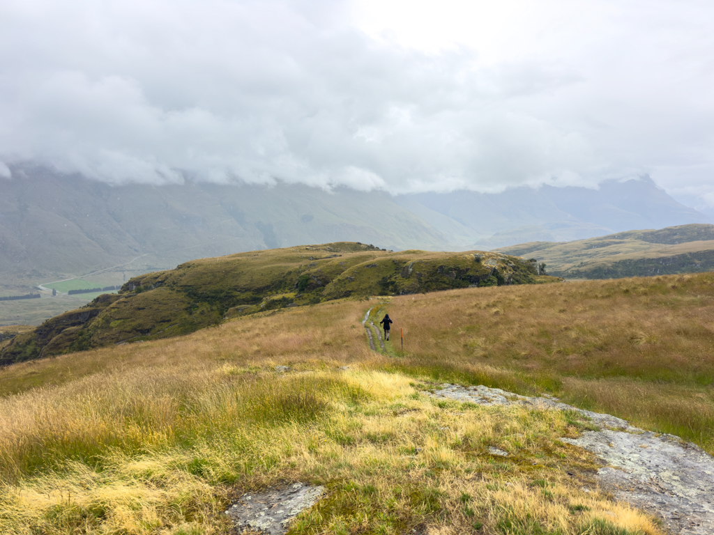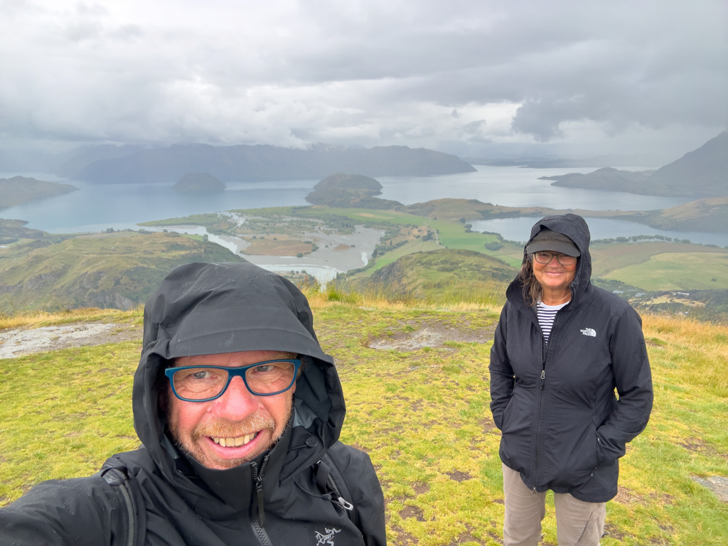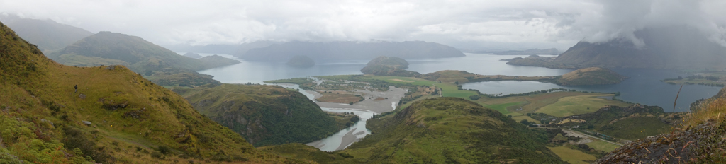 Von hier oben haben wir trotz der tiefhängenden Regenwolken einen weiten Blick auf den unter uns liegenden Lake Wanaka.