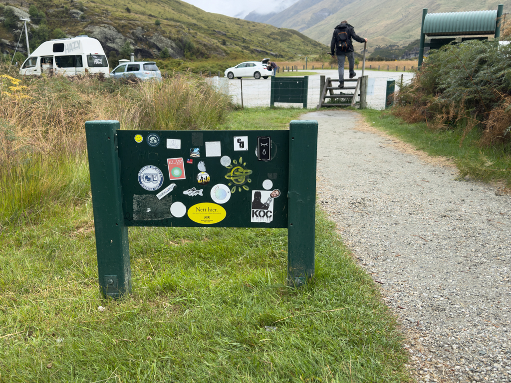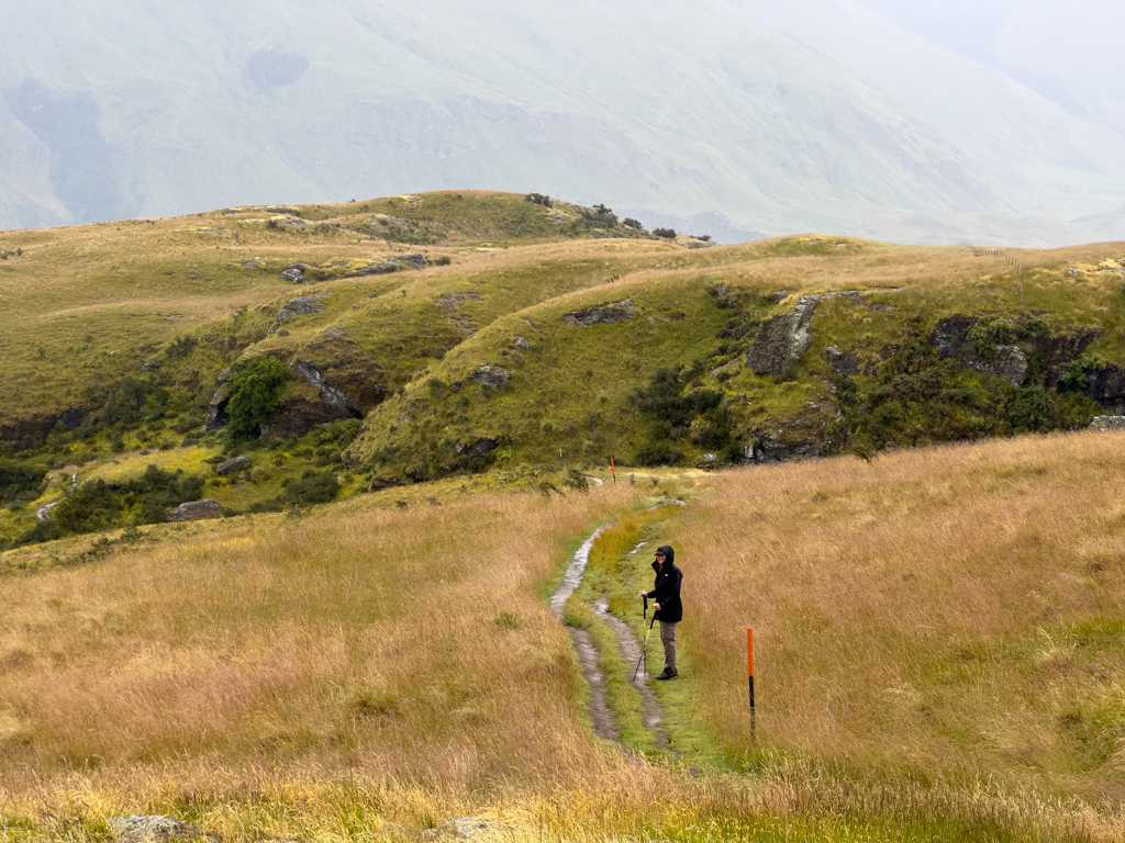 Andere Wanderer zeigten uns glücklich ihre Fotos und Videos vom Kārearea / Falken, der hier angesiedelt ist. Uns bleibt dieser Vogel leider verborgen. Leider ist die Aussicht auf den dahinter gelegenen Lake Hāwea, wo wir noch vor 3 Tagen waren, regengrau verhangen.