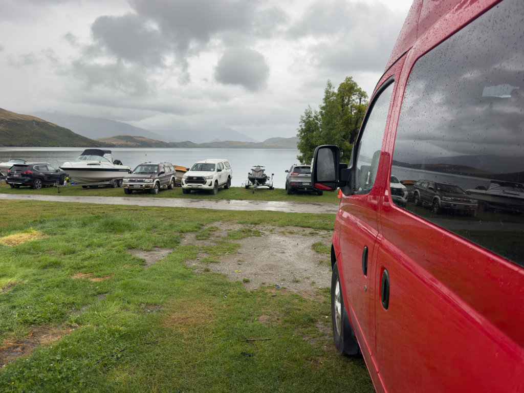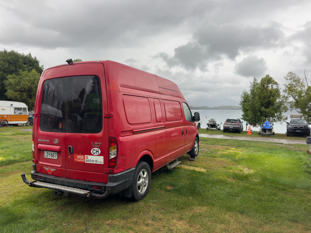 Durchnässt von der Wanderung kommend, nehmen wir unseren neuen Stellplatz in Beschlag. Hier sind wir schon näher am See, aber auch mitten im Partygeschehen der Nachbarn. Wobei wir schnell merken, dass der neue Platz nicht unbedingt auch der bessere ist. Aber für eine Nacht geht’s, und schliesslich wird hier nicht die Nacht hindurch Party gemacht.