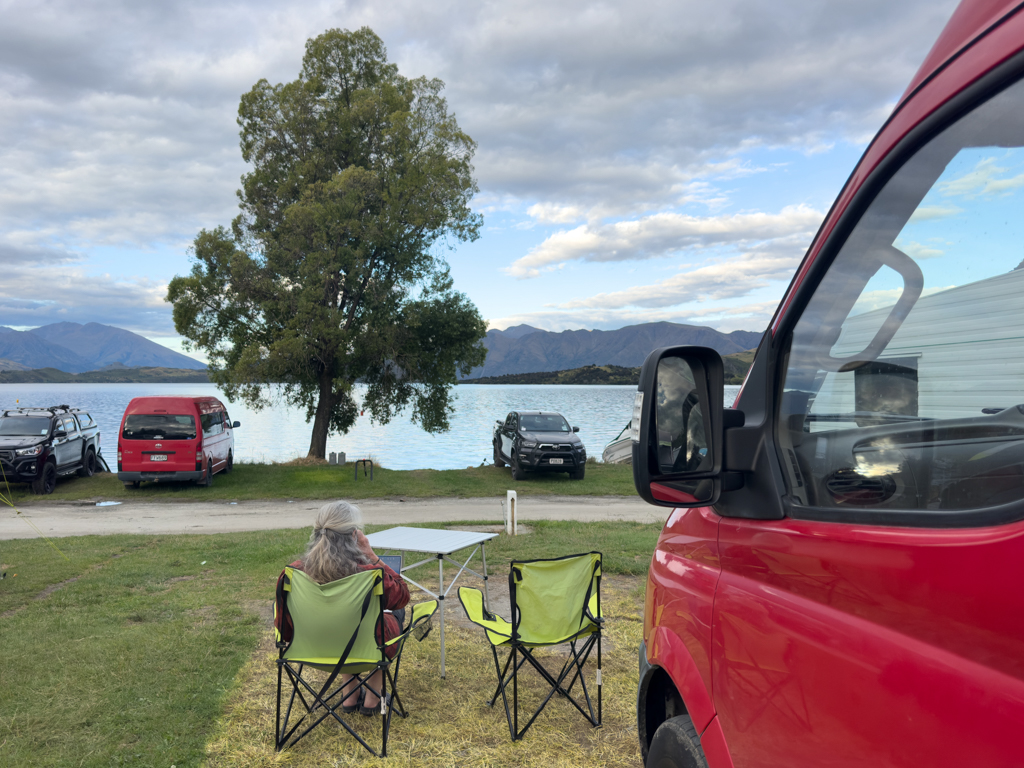 Überrascht, dass es plötzlich schon nach 18 Uhr ist, packen wir unsere Siebensachen zusammen, um uns nochmals ins Getümmel des Glendhu Bay Campgrounds zu stürzen. Mittlerweile hat Ma eine Abbuchung und Quittung für 6 NZD erhalten – ein klares Zeichen, dass sie für uns einen Platz mit Seesicht gefunden haben, der eben diese 6 NZD mehr kostet. Wir zügeln also wieder ein paar Plätze weiter. Auch wieder «mitten im Kuchen», zwischen all den Langzeit-Ferien-Campern. Unsere Nachbarn zur Linken,sind ein ganzer Familienclan aus Geschwistern, Eltern (die schon seit mehr als 30 Jahren hier ihre Ferien verbringen), Cousins und Cousinen, die hier teilweise ihre ganzen 5-wöchigen Sommerferien verbringen.