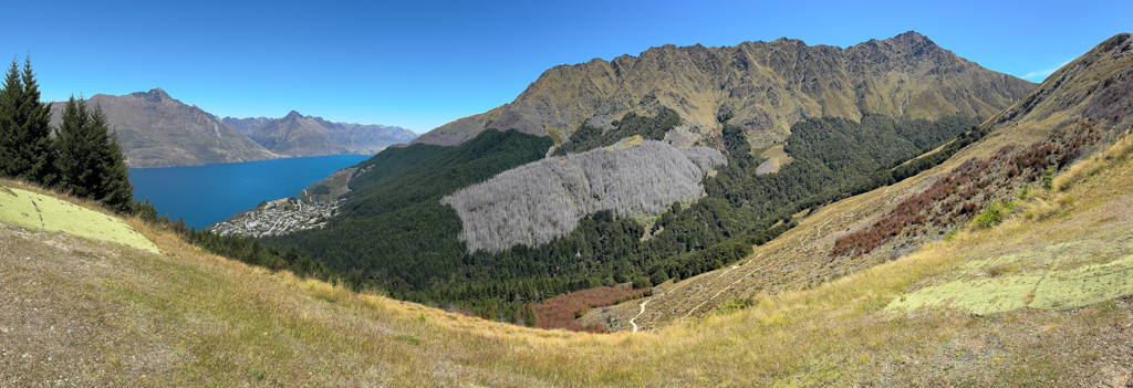 Wir wundern uns über den abgestorbenen Nadelwald hoch über Queenstown. Was ist hier geschehen? Die Lösung des Rätsels finden wir später auf einer Tafel am Ben Lomond Track bzw. hier: https://www.wildingpines.nz. Die invasiven, schnell wachsenden und sehr dicht stehenden Nadelbäume werden hier mit verschiedenen Strategien bekämpft (u.a. Pestiziden), um der einheimischen Flora und Fauna der offenen Grasflächen eine Chance zu geben, zu überleben.