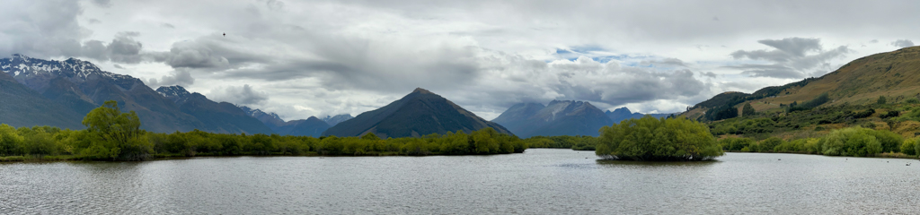 Zuerst spazieren wir zum Mündungsdelta, wo der Dart River und der Rees River zusammen in den Lake Wakatipu münden. Wobei der Dark River einen wesentlich grösseren und weit mäandrierten Zufluss hat, als der recht schnell fliessende und schmalere Rees River. Wir sehen, dass dies eine recht beliebte Touristenattraktion ist.