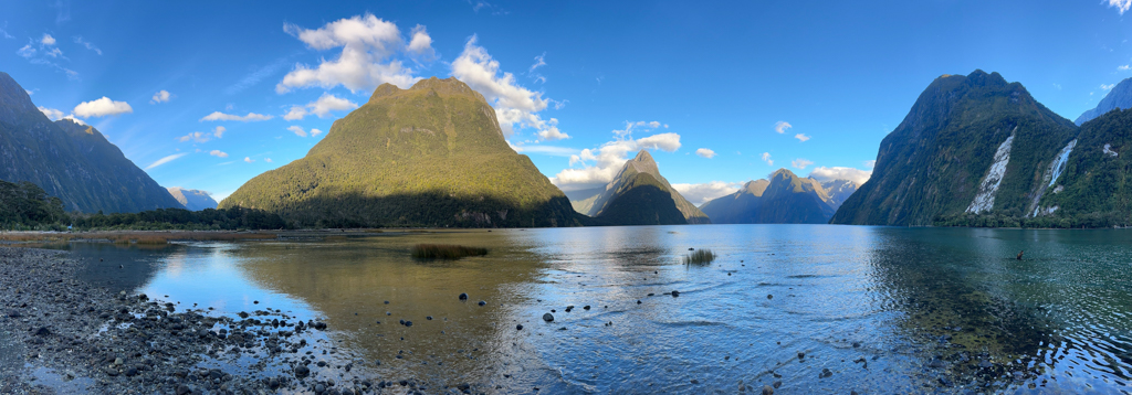 Nach einem kurzen Fussmarsch vom jetzt leeren Parkplatz, der gestern voll besetzt war, kommen wir am Milford Sound Lookout an. Etwas unerwartet, aber doch verständlich, sitzt schon jemand auf dem kleinen Bänkchen am Meer und hat sich dort vollkommen ausgebreitet. Selbstverständlich dürfen wir auch Platz nehmen, um unseren Kafi zum Wachwerden und Aufwärmen zu geniessen. «Nein», mit 52 Jahren sei er kein Student mehr, erzählt uns Jack fröhlich. Er hat ein 3-monatiges Visum und lebt ca. 2 Std. von Hong Kong entfernt. Er ist ein lustiger Geselle, sehr untypisch chinesisch… Er ist eigentlich mit dem Velo unterwegs, aber eine Mitbewohnerin von ihm im Barnyard B&B ist gestern mit dem Auto wegen der Bootstour im Milford Sound hierhergefahren und er ist kurz entschlossen mitgefahren. Weil er jedoch den Sonnenaufgang hier fotografieren möchte, hat er sich entschlossen hier zu bleiben und sich die Nacht auf der Parkbank um die Ohren zu schlagen.