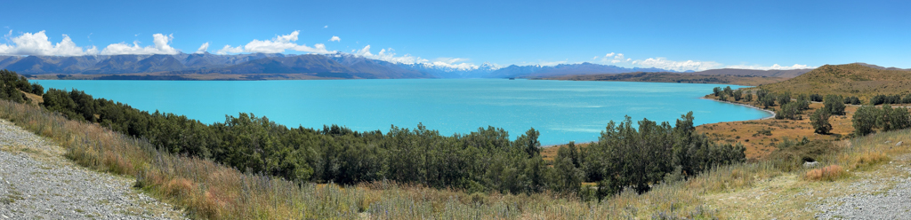 Kurz darauf biegen wir vom HWY auf eine Gravelroad ab, die uns auf der anderen Seeseite von Lake Pukaki entlangführt. Bei diesem sommerlichen Wetter fahren wir für einen Zwischensnack links(!) ran. Auf dieser Seeseite ist definitv weniger los. Wir geniessen die tolle Aussicht auf den türkisblauen See und die Schneeberge.